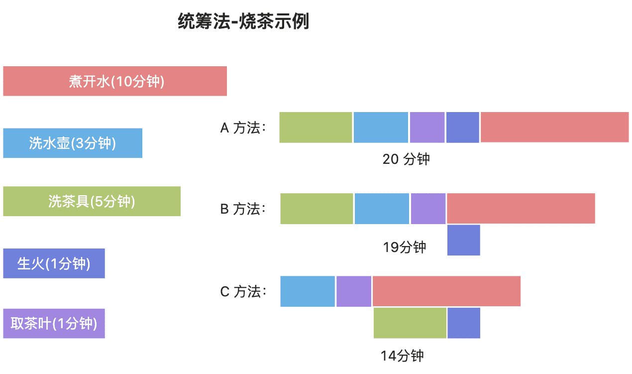 我国著名的数学家华罗庚使用泡茶的例子来说明统筹法,如下图所示: